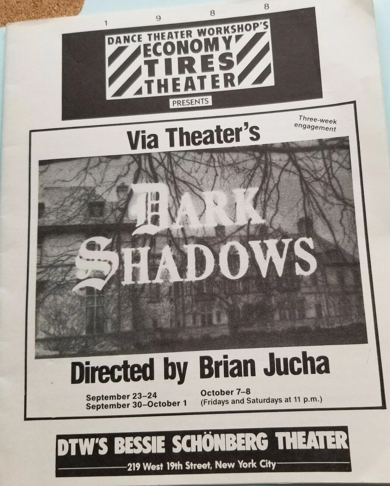 In September and October of 1988 an Off-Broadway stage version of 'Dark Shadows' was produced by the Via Theater and performed at Dance Theatre Workshop at 219 West 19th Street in New York. It starred actor Julian Stone as Barnabas Collins. The show was adapted and directed by Brian Jucha, with permission from Dan Curtis Productions.
